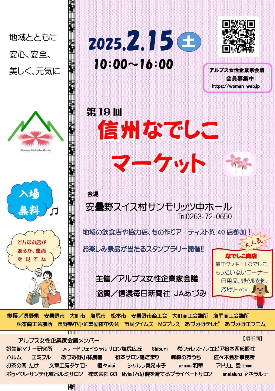 安曇野スイス村サンモリッツの中ホール2/15(土)10時~16時「信州なでしこマーケット」が開催されます。