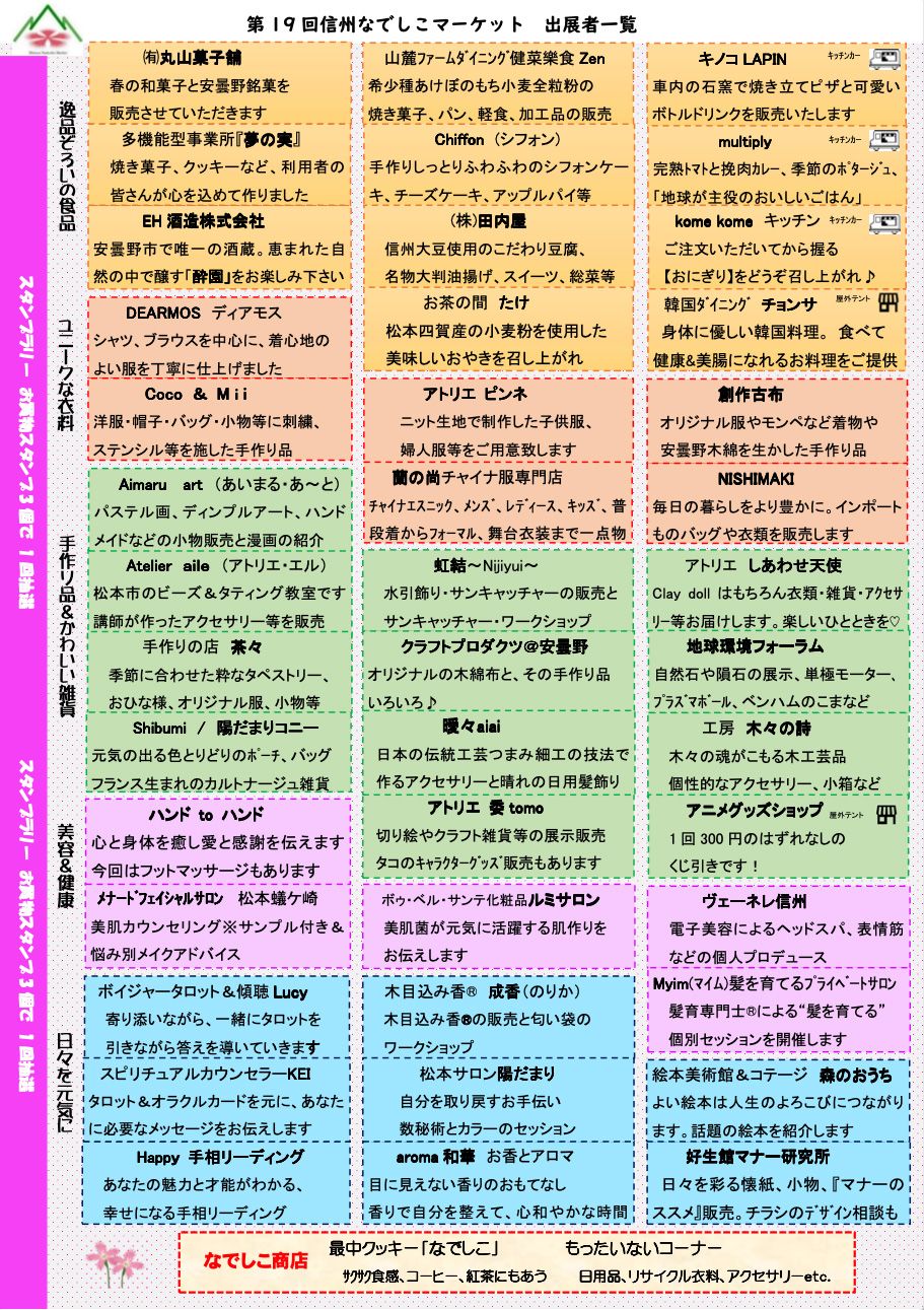 信州の女性起業家が中心として行われるこのマーケットは今回で19回目を迎え、今年は地域の飲食店や協力店が約42店舗参加&お楽しみ景品が当たるスタンプラリーに日用品や衣類のリサイクルを行うもったないコーナーの開設も予定されています。