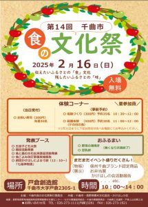 安曇野ICから麻績ICまで高速利用で50分程の千曲市戸倉創造館を会場に2/16(日)10時~14時「食の文化祭」が開催されます。