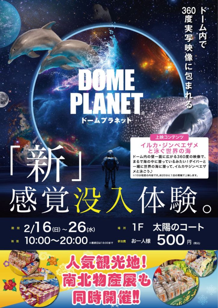 今回のドームプラネットは2/16(日)~26(水)まで開催の北海道・沖縄物産展との複合イベントということで「イルカ・ジンベエザメと泳ぐ世界の海」がテーマとなっているそうなので行ってみると楽しめそうです。