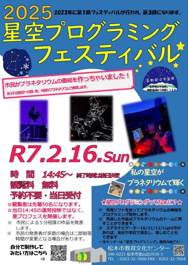 星空プログラミングフェスティバルは松本市教育文化センターで実施されていた星空プログラミング講座で作成された作品等の公開イベントで当日先着50名までとなりますが、無料で作成された作品の鑑賞ができます。