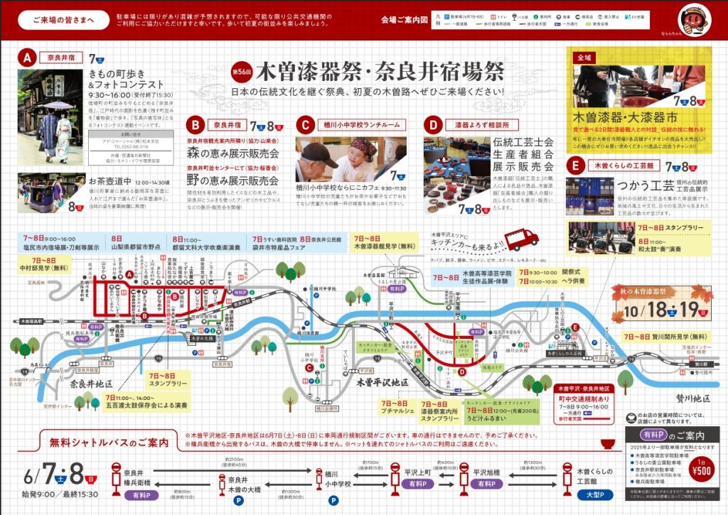 ※楢川小中学校や木曽くらしの工芸館等から無料シャトルバスも運行されています。