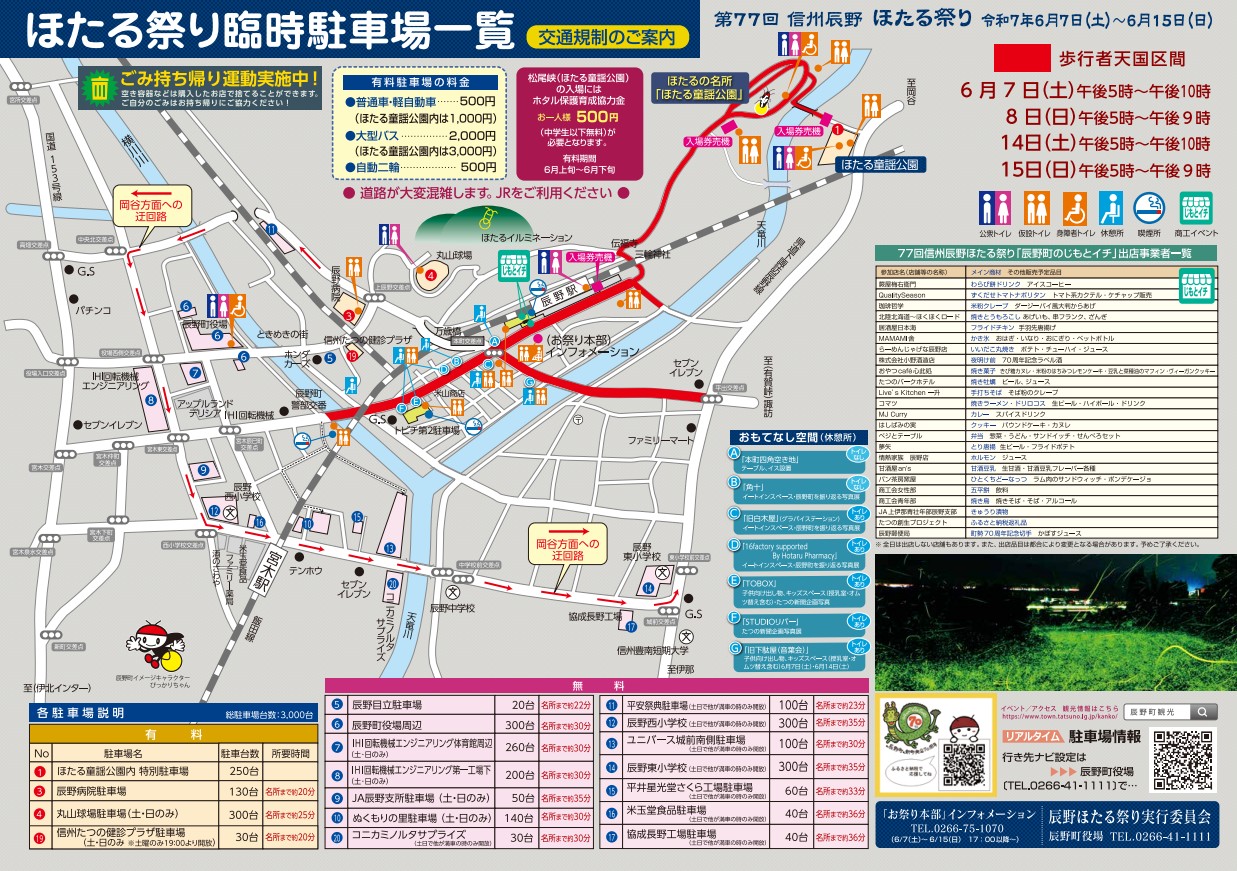 ※ほたる童謡公園駐車場(1000円)の他、有料駐車場(500円)、無料駐車場の設営等があります。⇒駐車場情報