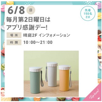 また毎月第2日曜日はアプリ感謝デーということで、晴庭2Fインフォメーションにてイオンモールアプリから二次元コードを読み取ってスタンプをGETすると先着150名に「タンブラー」のプレゼントもあるようなので要チェックです。