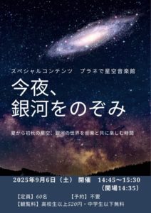 今回は「今夜、銀河をのぞみ」がテーマで音楽とプラネタリウムが楽しめます。今回も先着60名予約不要で、参加費高校生以上520円、鑑賞できるので行ってみると良いかもしれません。