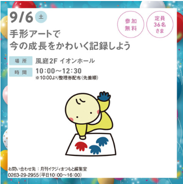 - 9/6(土) 手形アートで今の成長をかわいく記録しよう@松本市イオンモール松本