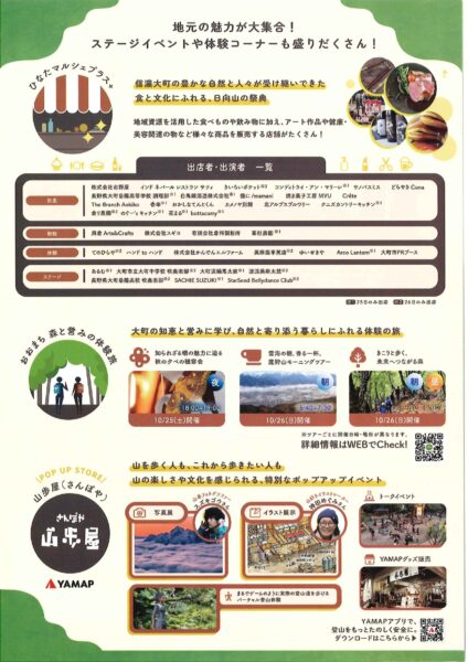 フェスタでは地元産の食べ物やアート作品、クラフト体験が出来る”ひなたマルシェ+”に大町の自然等を知れる”体験旅”(要予約)、山岳写真や山小屋イラストの展示がされたりYAMAP製品の購入ができる”山歩屋”等が行われるそうなのでチェックして行ってみると色々楽しめそうです。