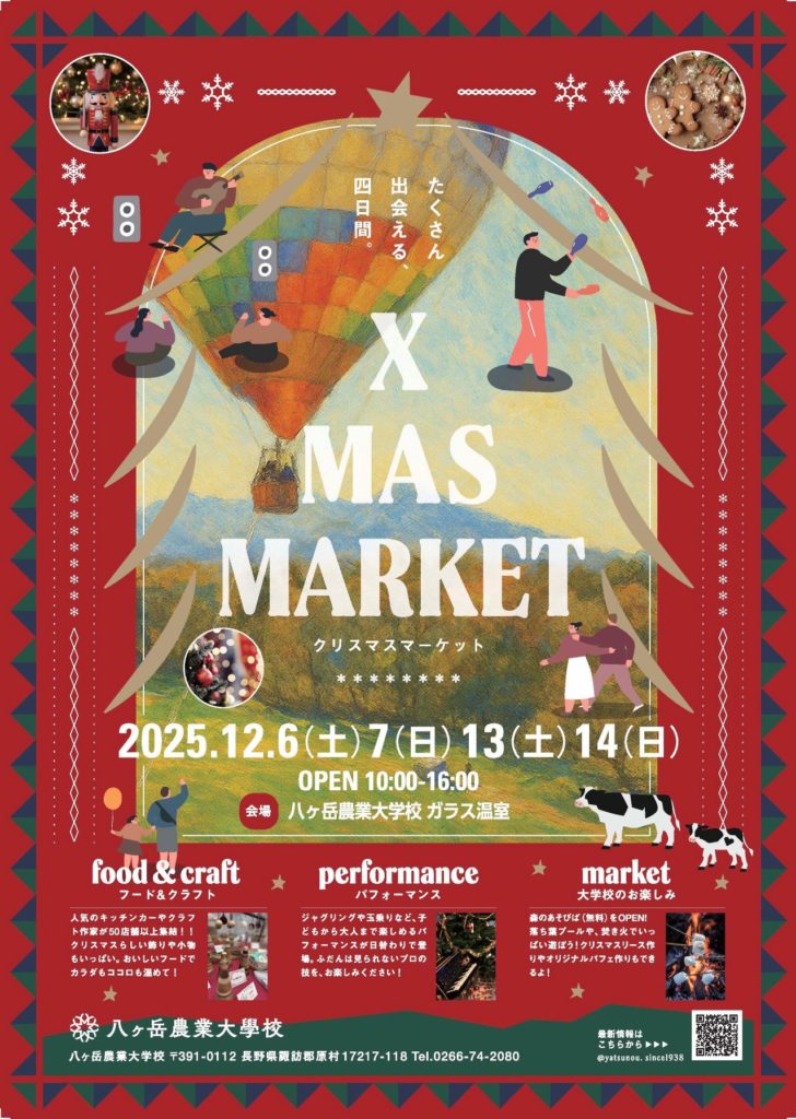 安曇野ICから諏訪南ICまで高速利用で約1時間の原村八ヶ岳農業大学校で12/6(土)-7(日)&13(土)-14(日)10時~16時「Xmasマーケット2025」が開催されます。