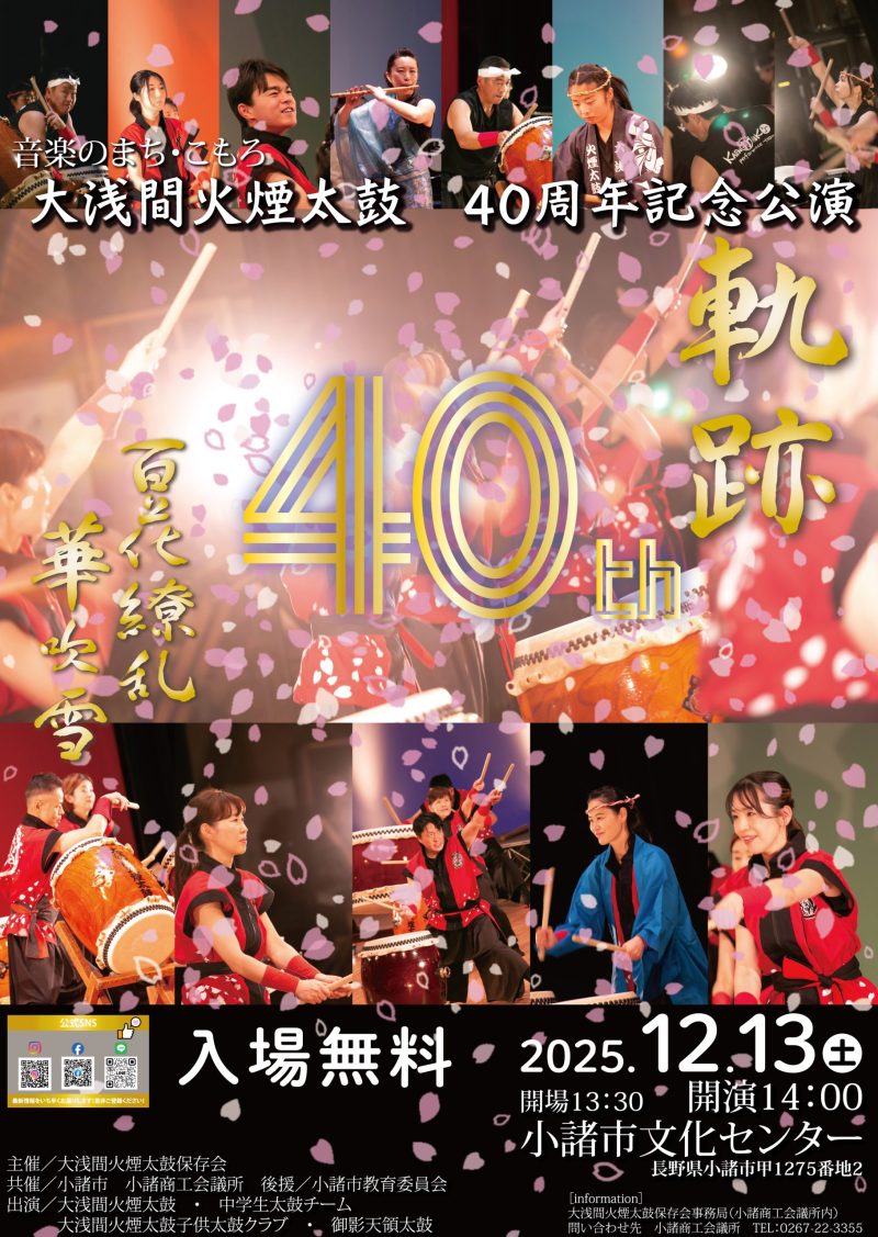 安曇野ICから車で1時間30分程の小諸市文化センターで12/13(土)13時半開場、14時~大浅間火煙太鼓の40周年を記念した公演が開催されます。