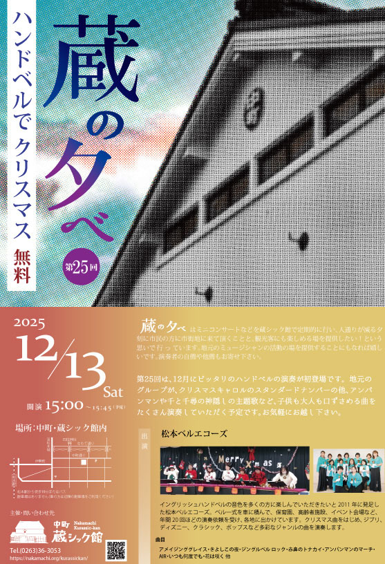松本市中町の蔵シック館を会場に12/13(土)15時~45分程、地元ハンドベル同好会による無料の演奏会「蔵の夕べ~ハンドベルでクリスマス」が開催されます。