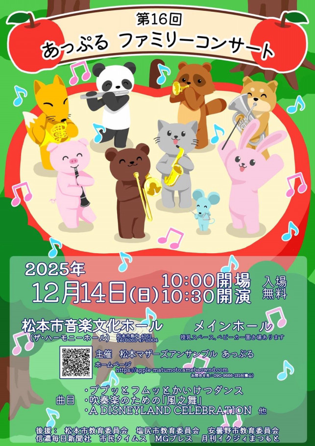 松本市音楽文化ホールを会場に12/14(日)10時開場、10時半~11時半予定で今年も「あっぷるファミリーコンサート」が開催されます。