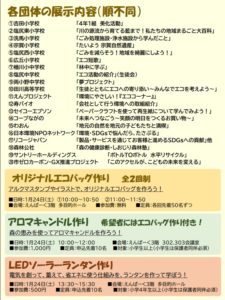 特に1/24(土)はわくわく企画として「オリジナルエコバック作り」(全2回,先着50名ずつ,無料)や要事前予約なので枠が埋まっているかもですが「アロマキャンドル作り」(小学生以上先着10名,1000円)や「LEDソーラーランタンづくり」(小4以上先着10名,500円)といったイベントが企画されています。