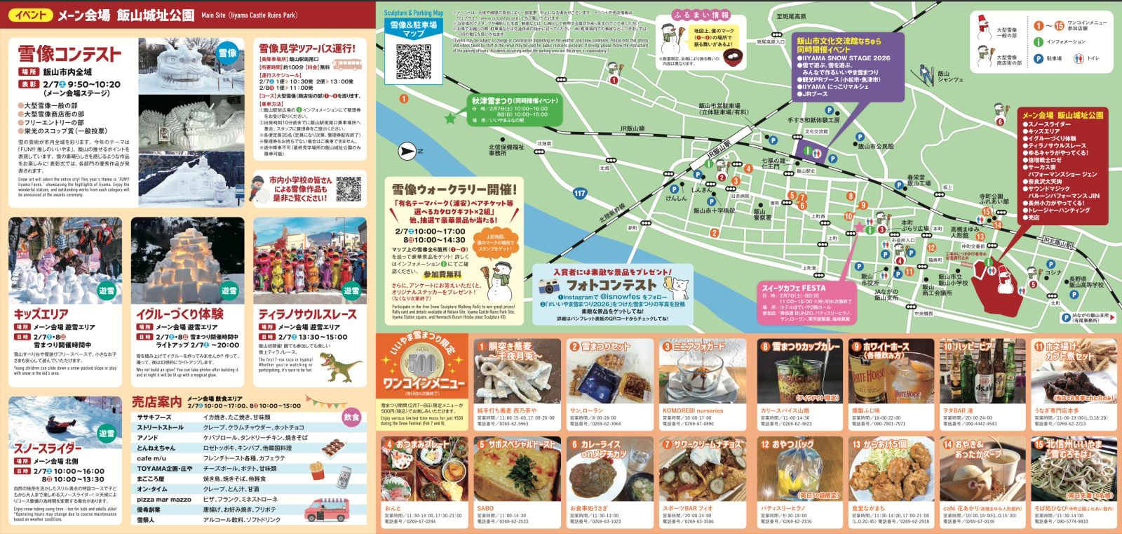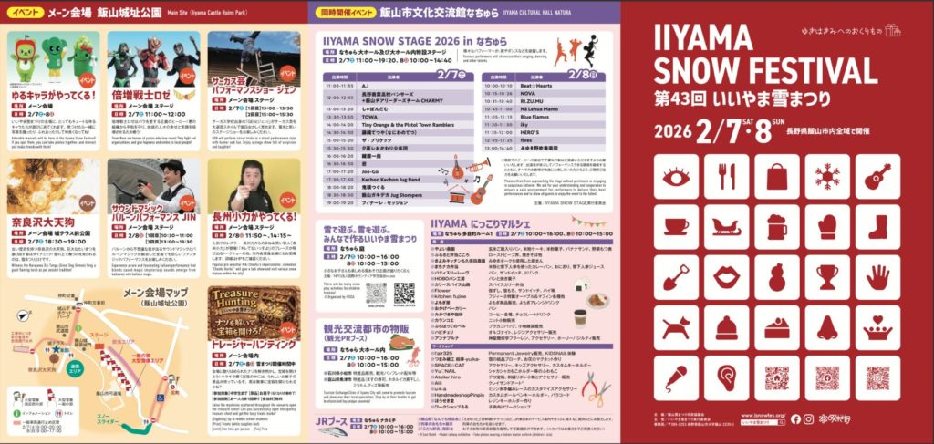 メーン会場は飯山城址公園で、スノースライダーやイグルーづくり体験の他、ティラノサウルスレースや各種パフォーマンスショーが予定されています。また、飯山市文化交流館なちゅらではIIYAMA SNOW STAGE 2026や雪遊びエリア、マルシエやJRブース、ホテルほていや2FではスイーツカフェFESTA,秋津のいいやまぶなの駅では秋津雪まつりとして各種雪遊びが行えたりします。また、市街各地で振る舞いが予定されていたり、テーマパークのペアチケットやカタログギフト等が当たる雪像ウォークラリー等も行われているので色々チェックして行ってみると楽しめそうです。