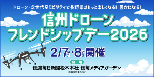 松本市信毎メディアガーデンで2/7(土)14時~17時と2/8(日)10時~17時、ドローンの楽しさ・おもしろさ・親しみやすさ、すごさを体感できるイベント・「信州ドローンフレンドシップデー」が開催されます。