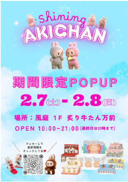 松本市イオンモールで2/7(土)-8(日)、人気のキャラクタートイ「ラブブ」を中心としたPop Up Store「shining AKICHAN」に国内外のブランド品のアウトレットブースの出店が予定されている他、2/8(日)は楽都・まつもとライブにアプリ感謝デーとして先着150名に万能便利スプーンのプレゼントも行われます。