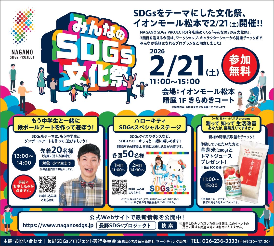 松本市イオンモールで2/21(土)11時~15時「みんなのSDGs文化祭」が開催されます。