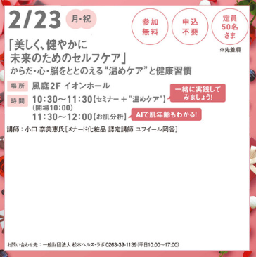 また、2/23は「美しく、健やかに未来のためのセルフケア」として、10時半~1hセミナーが行われる他、11時半~12時はAIでお肌年齢もわかる”お肌分析”が実施される予定なので行ってみるのも良さそうです。