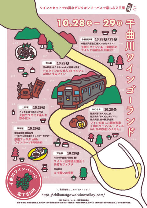 28(土)は田中駅前で「おんせんdeハロウィンマルシェ」(11時~16時)、大屋駅前で「角打ち-ワインスタンド&カフェ」(10時~17時)、戸倉駅では「ワイン×日本酒大集合 角打ちフェスタ」(12時~18時)。