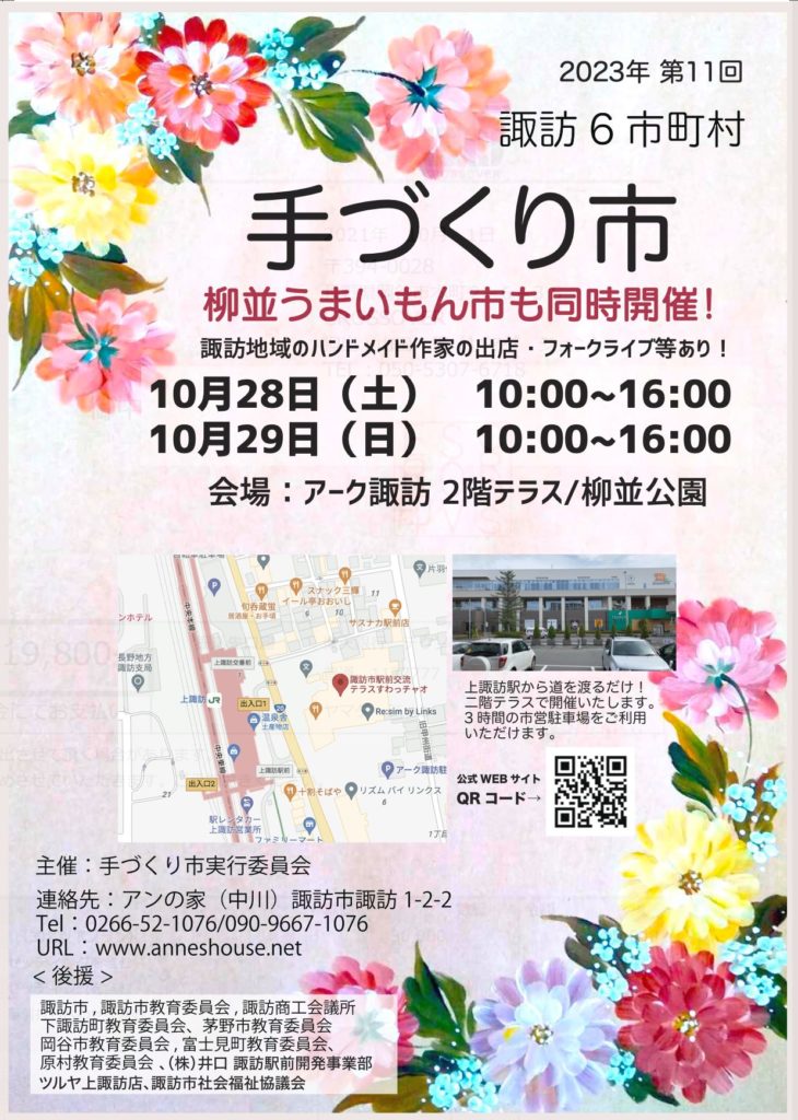 安曇野ICから岡谷ICまで車で45分程、上諏訪駅の前にあるアーク諏訪を会場として、10/28(土)-29(日)10時~16時「諏訪6市町村 てづくり市」が開催予定です。