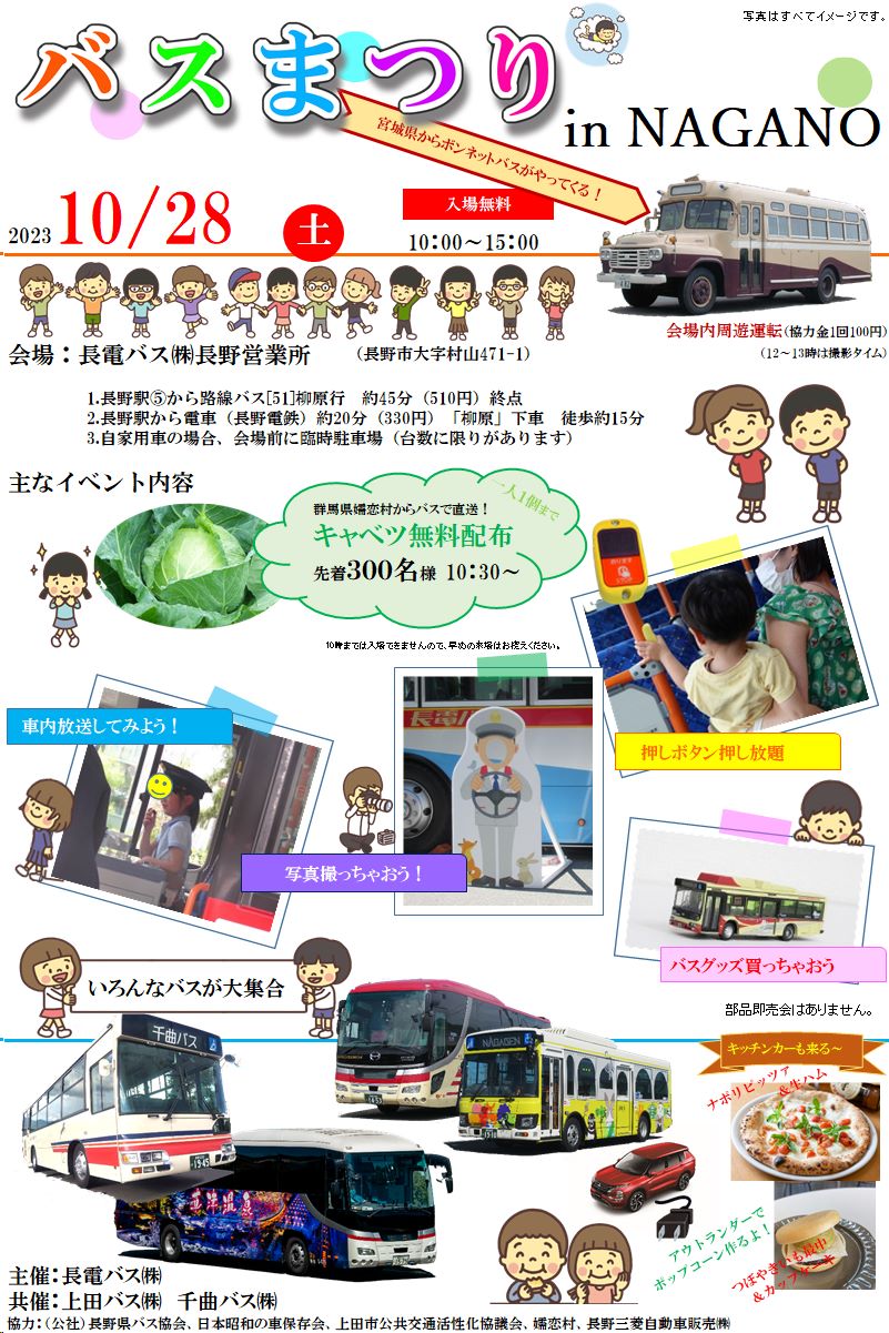 安曇野ICから須坂長野東ICまで高速利用で55分程の長電バス長野営業所を会場として10/28(土)10時~15時「バスまつり」が開催されます。