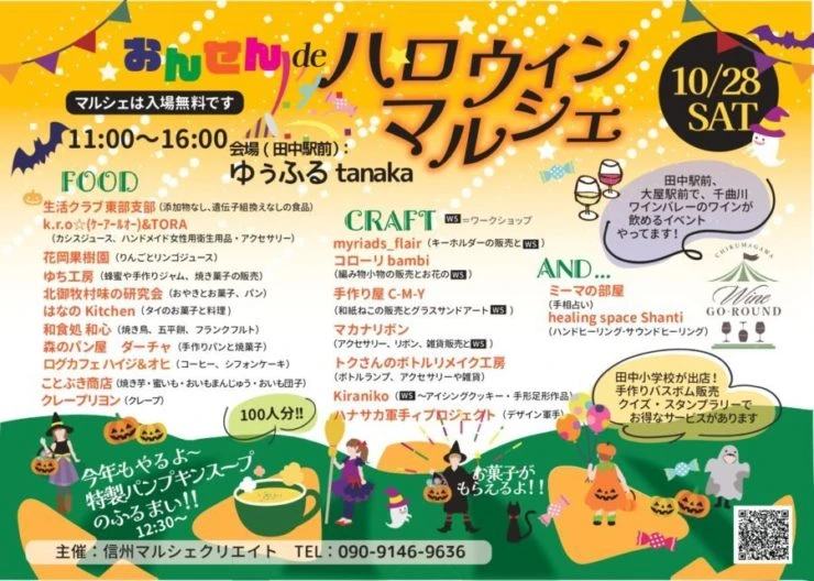 28(土)は田中駅前で「おんせんdeハロウィンマルシェ」(11時~16時)、大屋駅前で「角打ち-ワインスタンド&カフェ」(10時~17時)、戸倉駅では「ワイン×日本酒大集合 角打ちフェスタ」(12時~18時)。