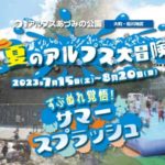 | ‐8/20 | 夏のアルプス大冒険/ ウォーターパーティ ![]() | 国営アルプス あづみの公園 (穂高・堀金地区) | 一部要 | 15歳以上当日券450円 2日通し券500円。 (15歳未満無料) + イベントによっては 追加費用あり。 | じゃぶじゃぶ池(無料、遊具貸出有)や水上アスレチック(4歳以上、1名500円)を楽しむことが出来る他、土日祝日はニジマスつかみ取り体験(先着100名,1匹800円)も可能。 また、園内を巡ってクイズを解いていく「草太の謎解き音楽会」(5/27~10/29)や里山文化ゾーンのヒマワリ迷路もオススメです。 |