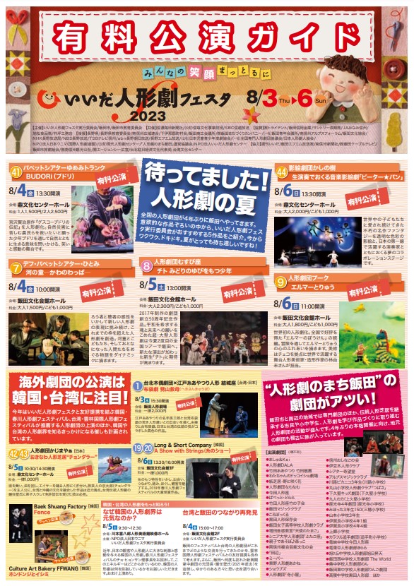 | 8/3-6 | いいだ人形劇フェスタ![]() | 飯田市+近隣 市町村の140施設 | 一部要 | 一部有料 | [HP] [Facebook] | 毎年8月上旬に開催される日本最大の人形劇の祭典。 飯田市+近隣の140会場で400以上の公演が繰り広げられる。 全公演の8~9割は参加証ワッペンを着用していれば自由に鑑賞可能。他、公演毎のチケットが必要な有料公演、企業や団体が費用を負担するので費用不要なプレゼント公演があり。 また、劇の鑑賞の他にも人形を作ったり動かしたりするワークショップの開催もあり。 ※8/5(土)は飯田りんごん祭りも同時開催 |
