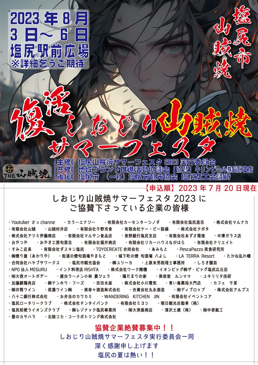 | 8/3-6 | しおじり山賊焼き サマーフェスタ ![]() | 塩尻市塩尻駅前 | - | - | [HP] [Twitter] | 塩尻市駅前広場で山賊焼きなどの塩尻グルメやビール、ワインなどの露店販売がされる他、お笑いや歌などの催しが行われる予定です。 8/3(木)-4(金)は17時~21時、8/5(土)-6(日)は11時~21時開催。 |