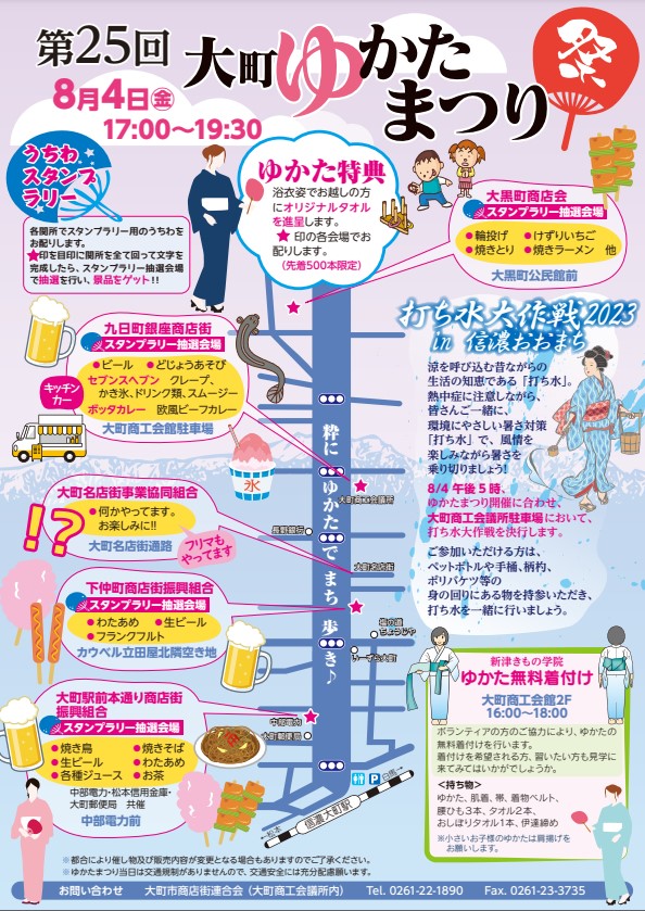 | 8/4 | 大町ゆかたまつり![]() | 大町市 信濃大町駅前通り | - | - | [HP] | やまびこまつりの前夜祭として8/4(金)17時~19時半、信濃大町駅前通りを会場に「大町ゆかたまつり」が開催されます。 浴衣姿で訪問すると先着500本でオリジナルタオルももらえます。 |