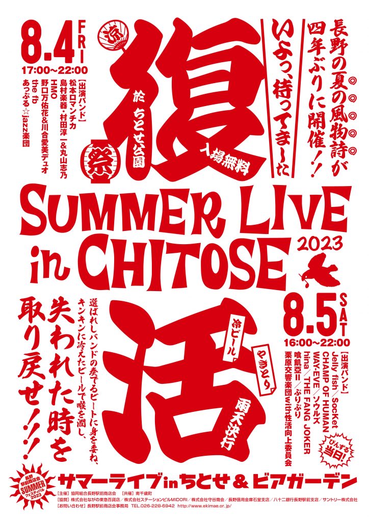 | 8/4-5 | 長野駅前商店会 サマーフェスティバル 2023 ![]() | 長野市駅前 南千歳公園 (ポッポ公園) | - | - | [HP] [Facebook] | 長野びんずるの前夜祭も兼ねて開催されるサマーフェスティバル。 4年ぶりの開催となる今年は4(金)は17時~22時、5(土)は16時~21時予定でそれぞれ6バンド、10バンドのライブがある他、様々なフードやドリンクの販売もされ、野外で食・酒・音楽が楽しめる予定です。 |