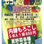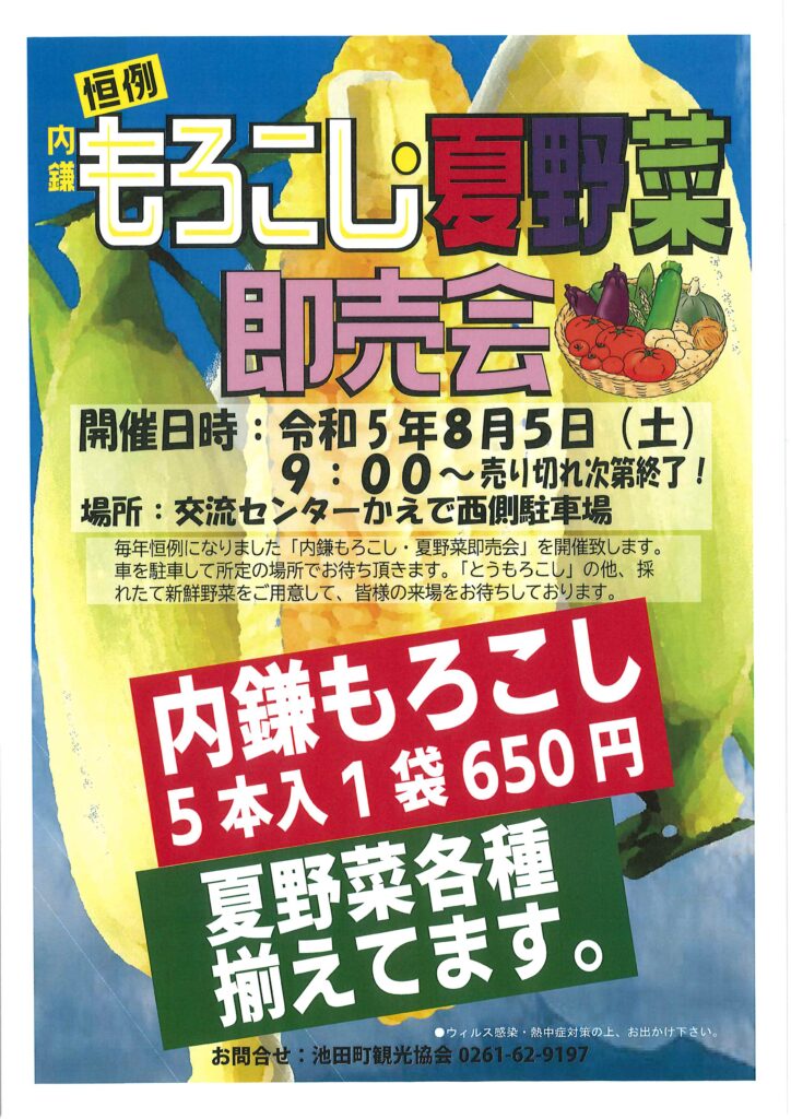 | 8/5 | 内鎌もろこし・夏野菜即売会![]() | 池田町 交流センターかえで | - | - | [HP] | 8/5(土)9時~池田町で育った内鎌もろこし、夏野菜の即売会が開催されます。 売り切れ次第修了のイベントなので気になる方は早めの訪問が〇です。 |