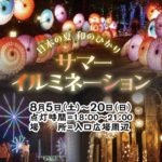 | 8/11 | いいやま灯篭まつり![]() | 飯山市本町商店街 高橋まゆみ人形館 | - | - | [HP] [Facebook] | 平成28年に「日本夜景遺産」に認定された飯山ののなつの風物詩。 夕暮れがかった飯山の街中を、伝統的工芸品である内山紙(うちやまがみ)などを使った手作りの灯篭、約10,000個が幻想的に演出します。 今年は、4年ぶりに屋台やダンスイベント等も復活予定。 |