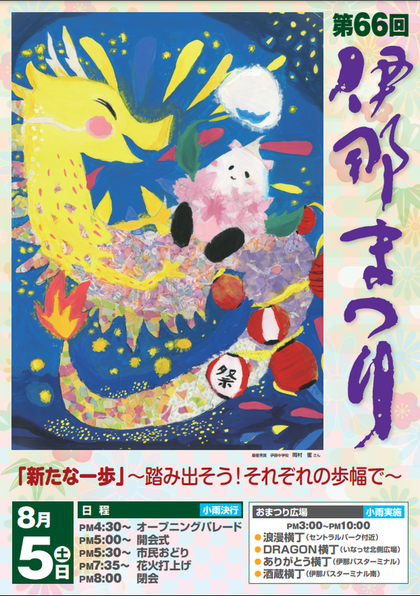 | 8/5 | 飯田まつり飯田りんごん | 飯田市街地 | - | - | [HP] [Instagram] [Twitter] | いいだ人形劇フェスタの開催期間中の土曜日に行われる飯田のお祭り。 11時~商栄会による催しや地域の団体によるダンス発表等があり、18時半~はりんごん踊り、19時~は花火(約250発)もある予定。 |