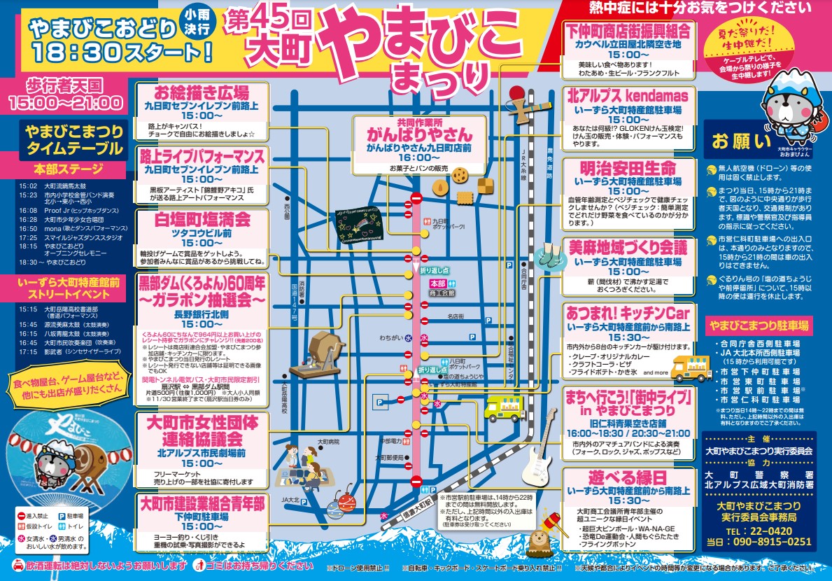 | 8/5 | 大町やまびこ祭![]() | 大町市 信濃大町駅前通り | - | - | [HP] | 大町の夏の恒例行事「大町やまびこまつり」が4年ぶりに開催されます。 8/5(土)15時から会場となる市街地中央通りを歩行者天国にして、和太鼓やダンス等のイベントが行われたり、縁日やキッチンカー販売を楽しめます。18時半~はやまびこ踊りが開催される予定です。 |