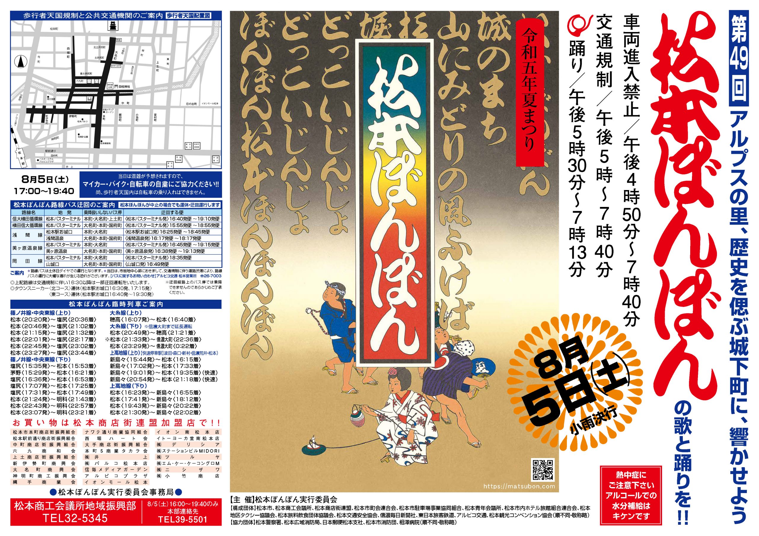 | 8/5 | 松本ぼんぼん![]() | 松本市市街地 | - | - | [HP] | 8/5(土)17時半~松本市を代表する祭り「松本ぼんぼん」が開催されます。 松本城~松本駅にかけての広い地域を歩行者天国にして行われるお祭りでは、114もの連が参加する予定になっています。 ※17時~20時頃まで交通規制もあり、大変混雑する予想なので、電車等を利用しての訪問がオススメです。 |