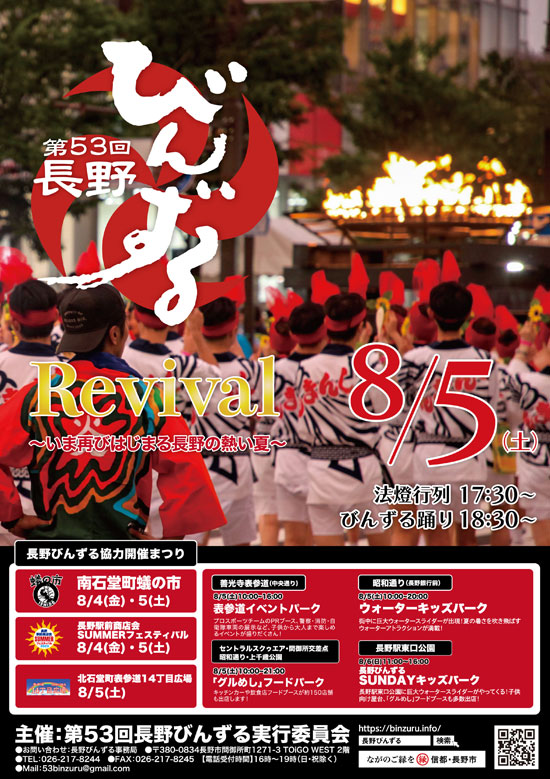 | 8/5-6 | 長野びんずる![]() | 長野市 駅前中央通り、 昭和通りなど | - | - | [HP] | 長野市の夏の大規模イベント「長野びんずる」が今年はコロナ流行前の通常規模で開催となります。 各日11時~各種イベントが開催される他、8/5(土)17:30~法燈行列、18:30~びんずる踊りが行われ賑わう予定です。 またこのイベントに合わせて、蟻の市やSUMMERフェスティバルも開催されるのでそちらも合わせて楽しむのが〇です。 |