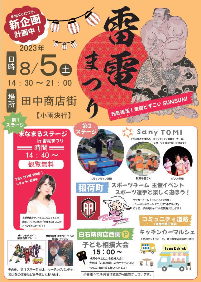 | 8/5 | 雷電まつり![]() | 東御市田中商店街 | - | - | [HP] | 東御市の夏の一大イベントである「雷電まつり」が4年ぶりに開催されます。 8/5(土)14時半~ステージ発表や屋台やキッチンカー販売などが行われ、18時~踊りが開催されます。 安曇野からだと1時間弱掛かるのでまつりだけを目的に行くのは△かもしれませんが、東御市方面に遊びにいく予定があるなら少し寄ってみると楽しそうです。 |