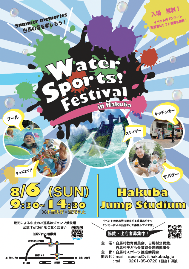 | 8/6 | Water Sports! Festival in Hakuba ![]() | 白馬村 白馬ジャンプ競技場 | - | - | [HP] [Twitter] | ジャンプ台を利用したウォータースライダーや大中小の様々なプール、水鉄砲を使ったサバイバルゲーム大会、キッズエリア、マルシェ等、暑い夏の日に子供も大人もびしょ濡れになって遊べるイベントとなっています。 |