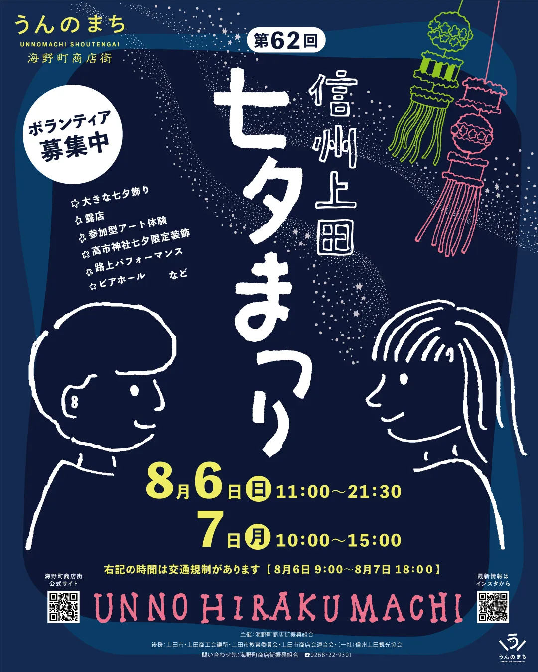 | 8/6-7 | 信州上田七夕まつり![]() | 上田市 海野町商店街 | - | - | [HP] | 東西300m程の商店街通りに約40の参加店による高さ15mの七夕飾りが立ち並ぶお祭り。 恒例となっている七夕飾りのコンテストの他、人気のキャラクターショーやビアホール、星空の茶会など、趣向を凝らし盛りだくさんのイベントが開催される模様。 |