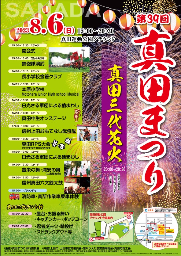 | 8/6 | 真田祭り![]() | 上田市 真田運動公園 | - | - | [HP] | 8/6(日)15時~20時半、様だ運動公園グラウンドを会場に開催される「真田まつり」は鉄砲演舞や武将隊によるステージ、真田六文銭太鼓など、郷土の勇士・真田三代を感じることの出来るイベントとなっています。 また、テント村では屋台やキッチンカーによるフード販売やダーツや輪投げ等子供が楽しめるイベントブースもあるので行ってみると楽しそうです。 20時~は30分程花火の打ち上げも予定されています。 |