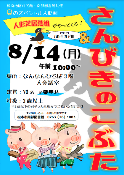 | 8/14 | 人形劇 「さんびきのこぶた」 ![]() | 松本市 なんなんひろば | 要申込 | - | [Twitter] | |