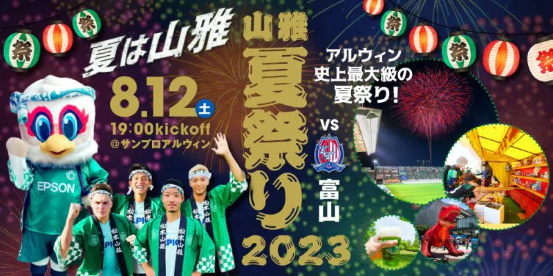 | 8/12 | 山雅夏祭り2023![]() | 松本市サンプロ アルウィン | - | - | [HP] | 8/12(土)カターレ富山戦に合わせて「山雅夏祭り2023」が開催されます。 輪投げや射的といった縁日イベントの他、巨大恐竜スプリンクラーや恐竜めいろなど子供が楽しめるイベントが沢山計画されている様です。 ※スイカ1玉がついた夏祭り限定ファミリーシートの販売もあります。 |
