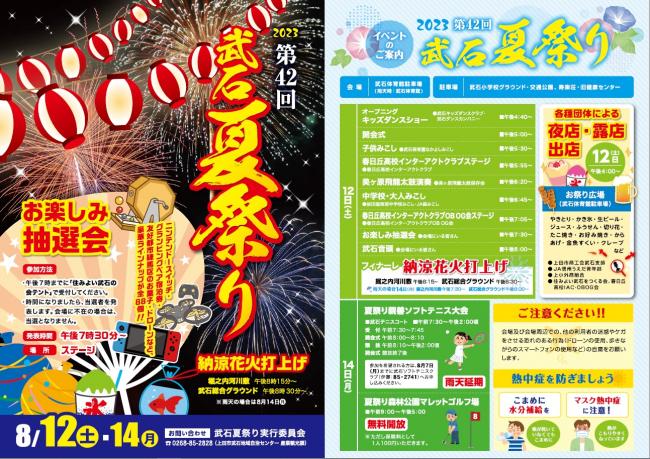 | 8/12-14 | 武石夏祭り![]() | 上田市 武石体育館駐車場、 総合グラウンド周辺 | - | - | [HP] | 上田市武石地区で毎年8/12-14に行われている夏祭り。 露店・夜店、各種ステージイベント、お楽しみ抽選会等があり、8/12には納涼打上げ花火もあがる。 (8/12が雨の際は8/14に延期) |