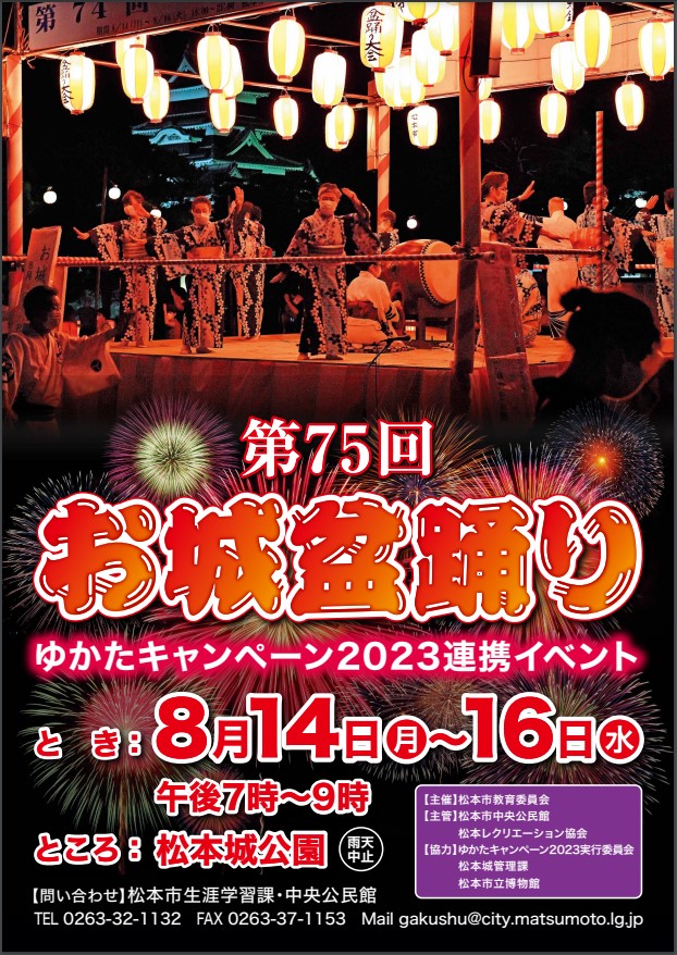 | 8/14-16 | お城盆踊り![]() | 松本市 松本城公園 | - | - | [HP] | |