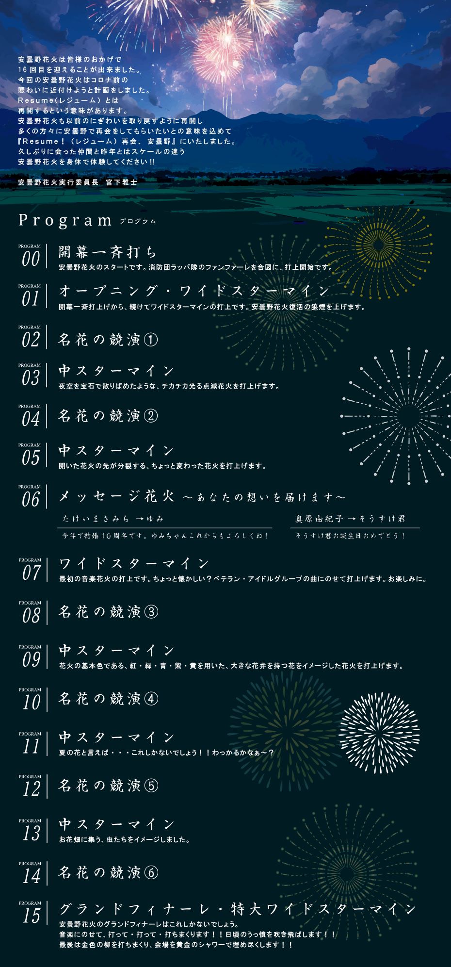 | 8/14 | 安曇野花火![]() | 安曇野市 御宝殿遊水地 東側 | 有料席あり | [HP] [Facebook] [Instagram] [Twitter] | ||