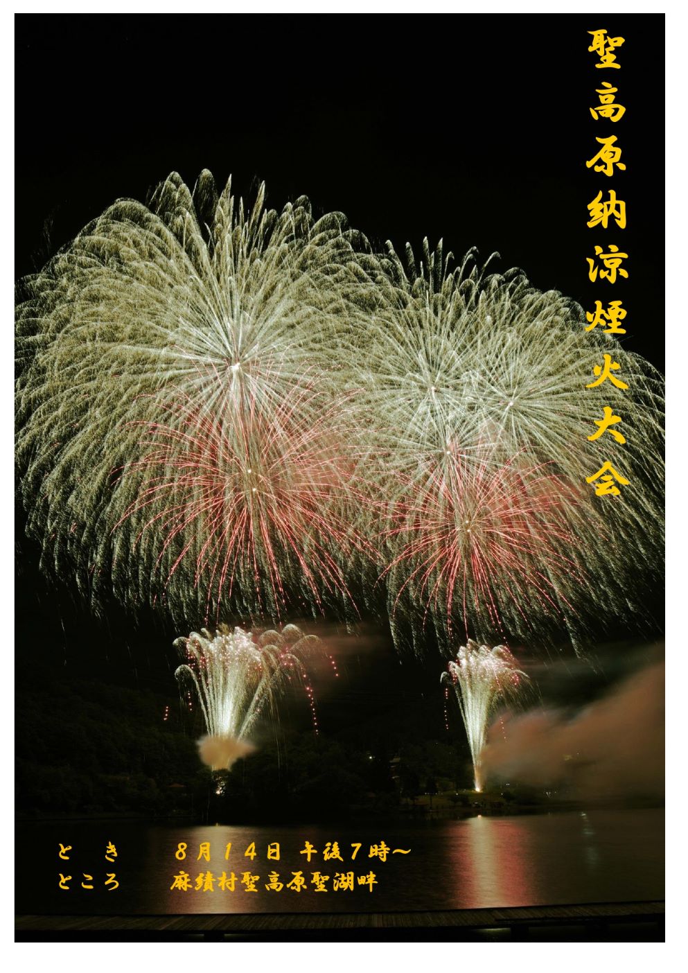 | 8/14 | 聖高原納涼煙火花火大会![]() | 麻績村 聖高原聖湖畔 | [HP] | |||
