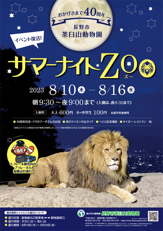 | 8/10-16 | サマーナイトZOO![]() | 長野市 茶臼山動物園 | - | 入園料要 大人600円 小中学生100円 | [HP] | 通常16時半で閉園する動物園が特別に21時まで開園し、普段は見ることができない夜の動物たちを、飼育員のガイドを交えながら観察出来るイベント。 |