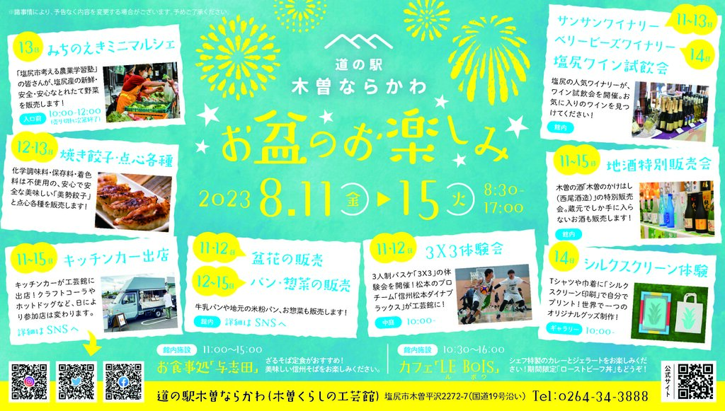 | 8/11-15 | お盆のお楽しみ![]() | 塩尻市 道の駅 木曽ならかわ | - | - | [HP] | |